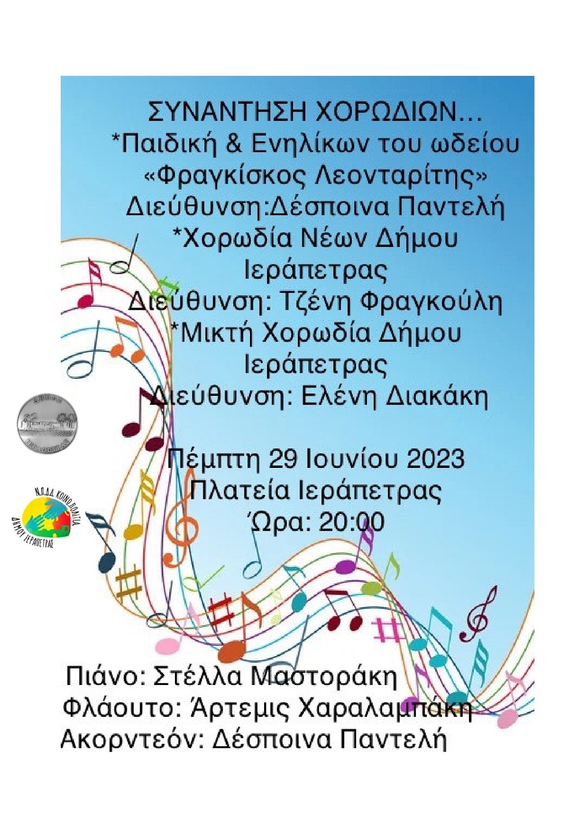 Η Χορωδία Νέων Δήμου Ιεράπετρας υπό τη διεύθυνση Τζένης Φραγκούλη. Μικτή Χορωδία Δήμου Ιεράπετρας υπό τη διεύθυνση Ελένης Διακάκη.