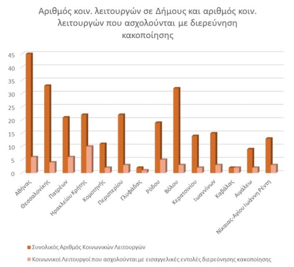 Οι 14 ερωτώμενοι Δήμοι λαμβάνουν κατά μέσο όρο (στο σύνολό τους) πάνω από 1000 εισαγγελικές εντολές ανά έτος. Από την έρευνα προέκυψε ότι, σε σύνολο 260 κοινωνικών λειτουργών και 45 ψυχολόγων που απασχολούνται στους 14 Δήμους που απάντησαν το ερωτηματολόγιο του Συνηγόρου, 42 κοινωνικοί λειτουργοί ασχολούνται με την διερεύνηση καταγγελιών κακοποίησης/παραμέλησης, δεδομένου ότι το προσωπικό είναι επιφορτισμένο με πολλές και διαφορετικές αρμοδιότητες και διαμοιρασμένο και σε άλλες υπηρεσίες των Δήμων (όπως σε ΚΑΠΗ, κέντρα κοινότητα, δημοτικούς παιδικούς και βρεφονηπιακούς σταθμούς κ.α).
