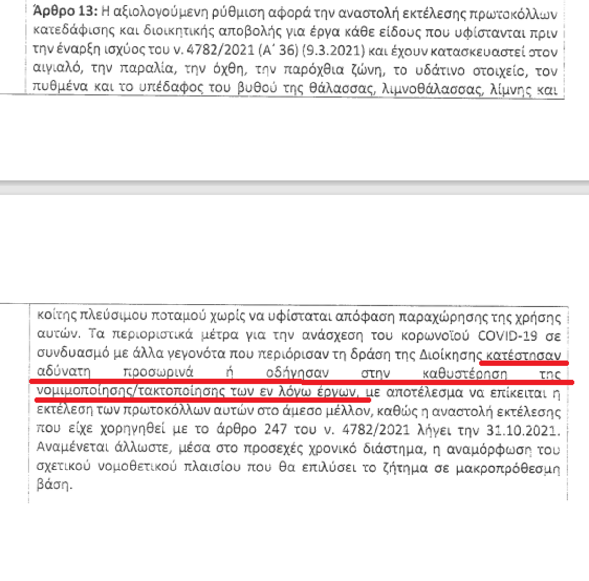 Εκτός από την κουτοπόνηρη αυτή τακτική της ομηρείας, η κυβέρνηση ισχυρίζεται ότι η παράταση δίνεται για να προχωρήσει σε νομιμοποίηση/ τακτοποίηση των αυθαιρεσιών, πράγμα που απαγορεύεται ρητά από το Σύνταγμα. Όποια προσπάθεια και να κάνει, θα ακυρωθεί στο ΣτΕ γιατί η απαγόρευση είναι ρητή. Εκτός αυτού, όλες αυτές οι υποθέσεις κατεδαφίσεων είναι δικαστικές αποφάσεις που έχουν τελεσιδικήσει μετά από πολλά χρόνια. Φαίνεται λοιπόν πως πρόθεση της κυβέρνησης δεν είναι να χρηματοδοτήσει τις αναπλάσεις και να προχωρήσει στην αποκατάσταση των παρανομιών, αλλά να διατηρήσει σε ομηρεία τα καταστήματα εστίασης για να συγκαλύπτει τις μεγάλες παρανομίες των καταπατητών - “πελατών” της. Για του λόγου το αληθές, επισυνάπτουμε και την αιτιολογική έκθεση της τροπολογίας που αναφέρει ακριβώς το σχεδιασμό της κυβέρνησης. Αιτία για όλα αυτά βέβαια είναι ο ... κορωνοϊός!