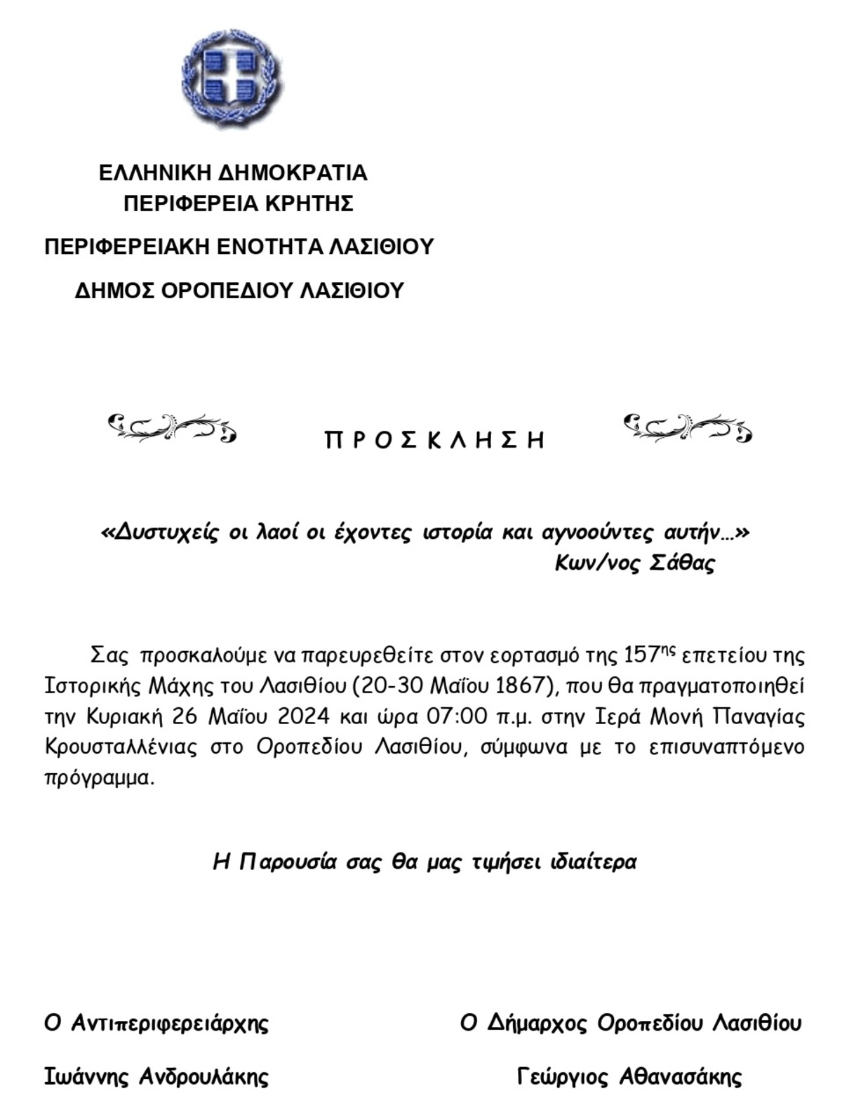 Την ημέρα αυτή θα τιμηθεί, με την προσήκουσα λαμπρότητα, η ηρωική εξέγερση των Λασιθιωτών, οι οποίοι διατηρώντας άσβεστη τη φλόγα του πατριωτισμού ένωσαν τις δυνάμεις και τα όνειρά τους μαζί με όλους τους Κρήτες για τον υπέρτατο αγώνα της απελευθέρωσης της Μεγαλονήσου από τον Οθωμανικό ζυγό και ένωσή της με την Ελλάδα.