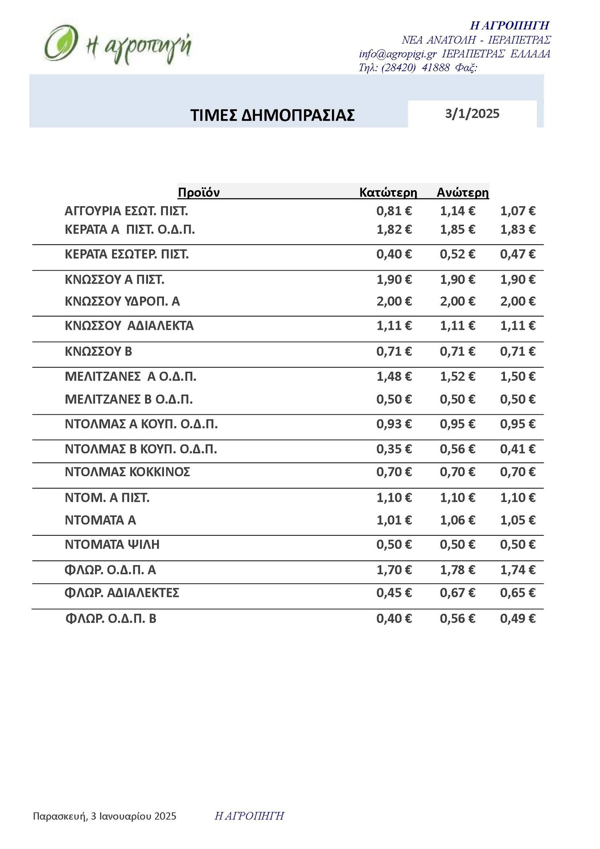 Τιμές Αγροτικών Προϊόντων 03-01-2025 ΤΙΜΕΣ 12:18 μ.μ. - Παρασκευή 3 Ιανουαρίου 2025 12:01 μ.μ. - Παρ, 03/18/2025 ΙΕΡΑΠΕΤΡΑ, ΤΙΜΕΣ ΑΓΡΟΤΙΚΩΝ ΠΡΟΙΟΝΤΩΝ , ΔΗΜΟΠΡΑΣΙΑ, ΚΗΠΕΥΤΙΚΑ ΠΡΟΙΟΝΤΑ Δείτε αναλυτικά εδώ τις τιμές των κηπευτών για σήμερα 03-01-2025
