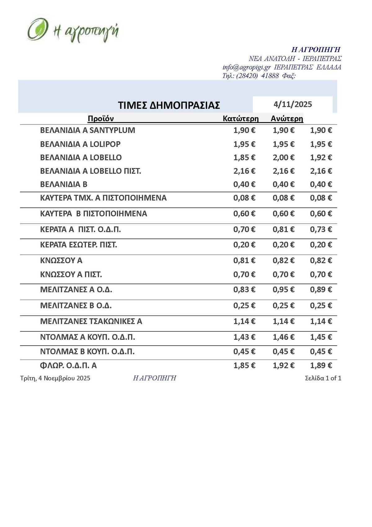 ΤΙΜΕΣ 10:14 π.μ. - 03/11/2025 Τιμές Αγροτικών Προϊόντων 03.11.2025 ΙΕΡΑΠΕΤΡΑ, ΤΙΜΕΣ ΑΓΡΟΤΙΚΩΝ ΠΡΟΙΟΝΤΩΝ, ΔΗΜΟΠΡΑΤΗΡΙΟ, ΚΗΠΕΥΤΙΚΑ Δείτε τις σημερινές τιμές του δημοπρατηρίου