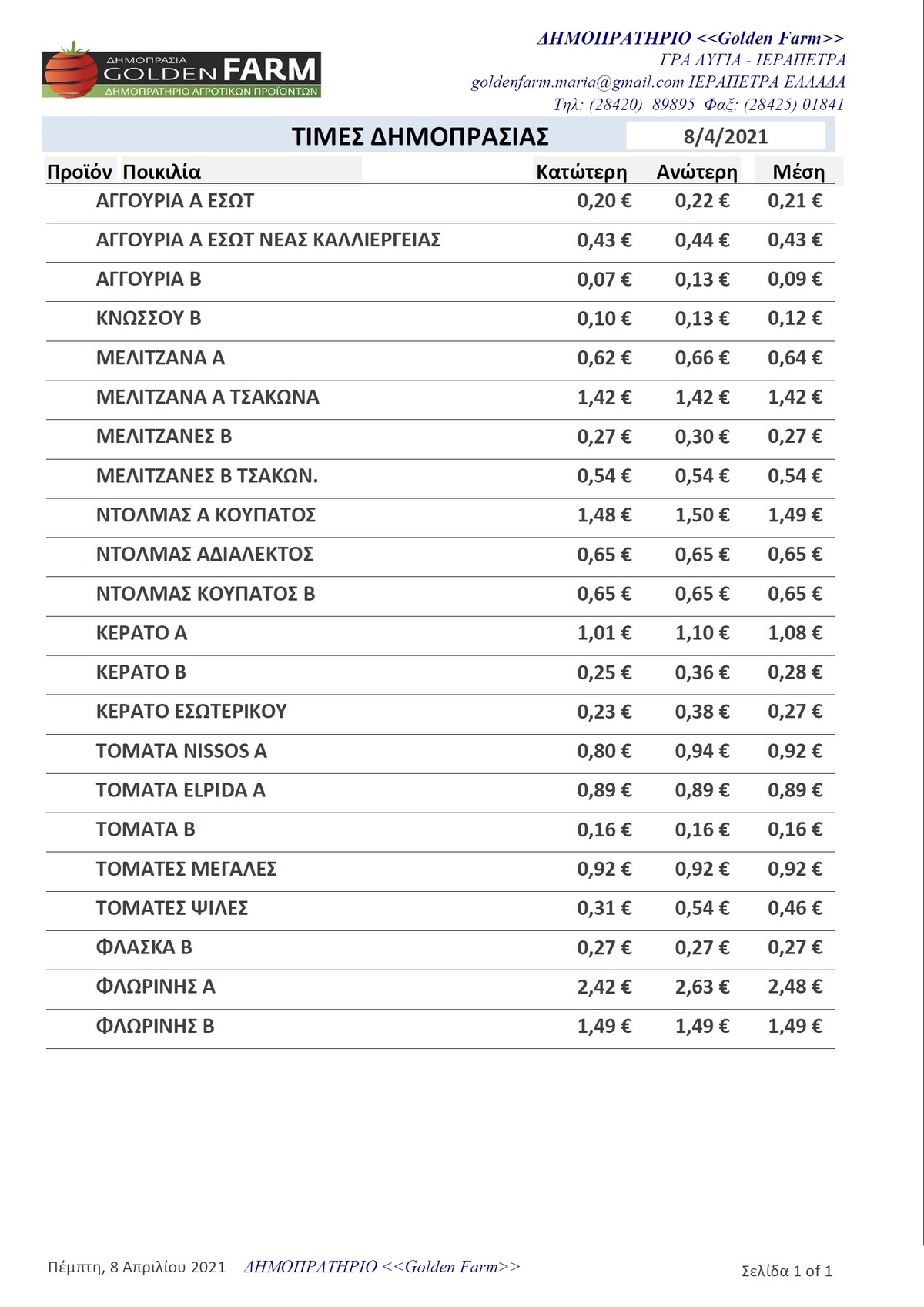ΤΙΜΕΣ 01:24 μ.μ. - 25/03/2026 GOLDEN FARM |Τιμές Αγροτικών Προϊόντων 25.03.2026 ΙΕΡΑΠΕΤΡΑ, ΤΙΜΕΣ ΑΓΡΟΤΙΚΩΝ ΠΡΟΙΟΝΤΩΝ , ΔΗΜΟΠΡΑΤΗΡΙΟ, ΚΗΠΕΥΤΙΚΑ , GOLDEN FARM Δείτε τις σημερινές τιμές του δημοπρατηρίου