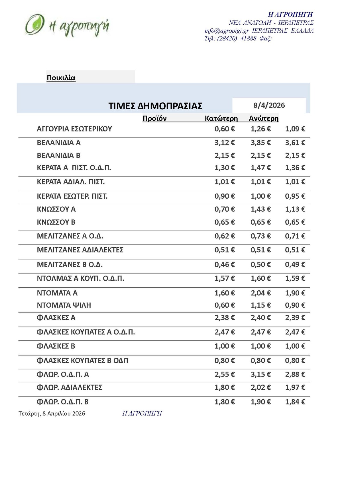 ΤΙΜΕΣ 07:35 π.μ. - 06/04/2026 Τιμές Αγροτικών Προϊόντων 06.04.2026 ΙΕΡΑΠΕΤΡΑ, ΤΙΜΕΣ ΑΓΡΟΤΙΚΩΝ ΠΡΟΙΟΝΤΩΝ , ΔΗΜΟΠΡΑΤΗΡΙΟ, ΚΗΠΕΥΤΙΚΑ ΠΡΟΙΟΝΤΑ Δείτε τις σημερινές τιμές του δημοπρατηρίου