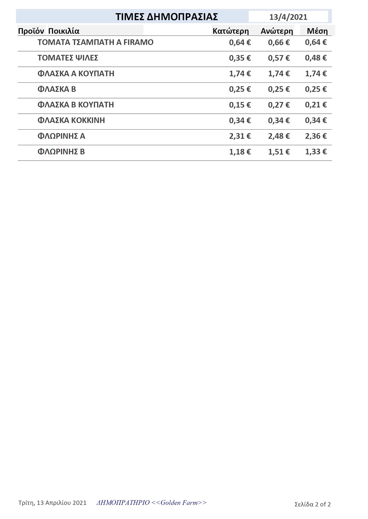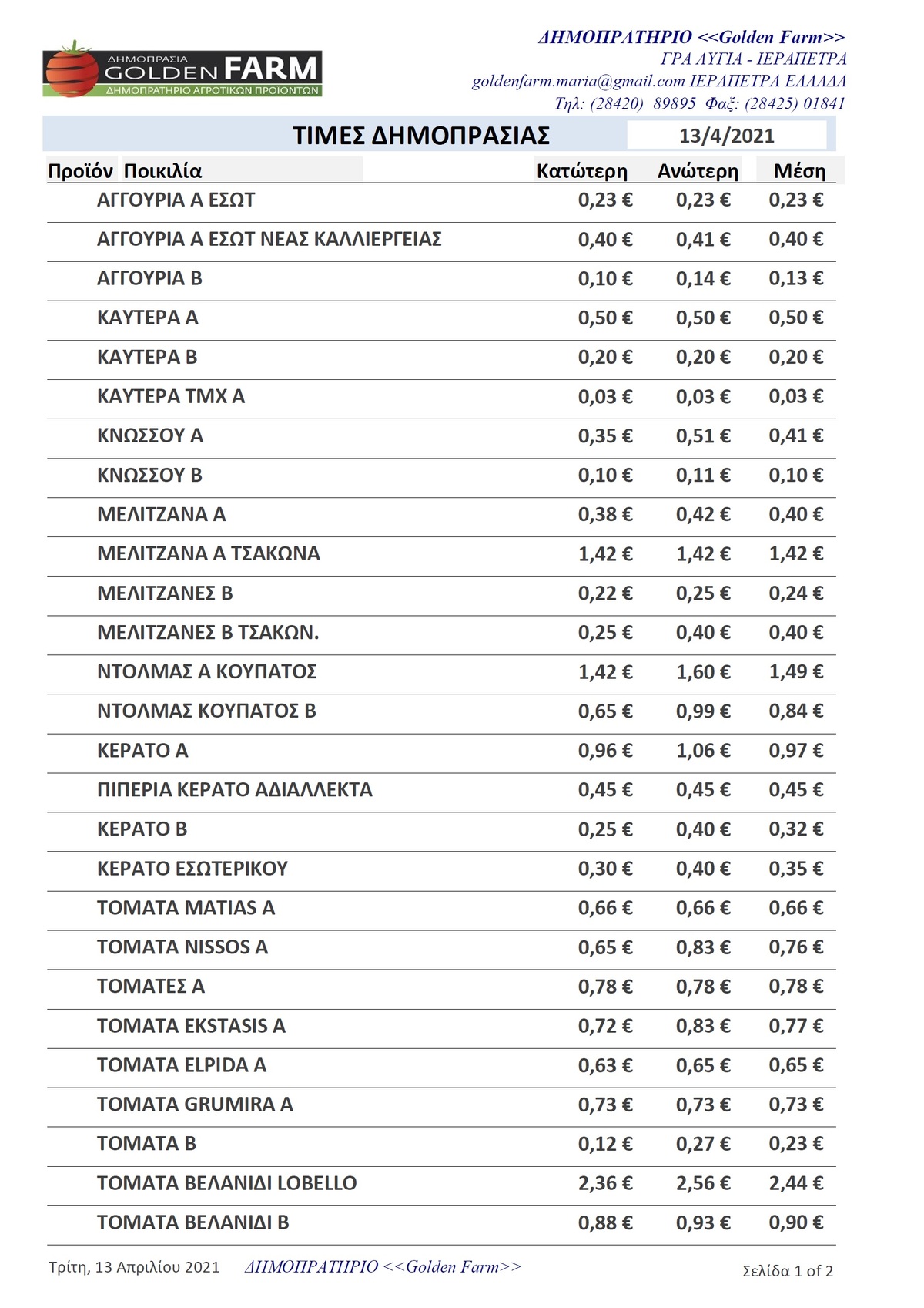 Τιμές Αγροτικών Προϊόντων 13-4-21 ΛΑΣΙΘΙ ΙΕΡΑΠΕΤΡΑ 1:56 μ.μ. - Τρίτη, 13 Απριλίου 2021 01:04 μ.μ. - Τρί, 13/56/2021 ΤΙΜΕΣ ΑΓΡΟΤΙΚΩΝ ΠΡΟΙΟΝΤΩΝ Δείτε εδώ τιμές δημοπρατηρίων