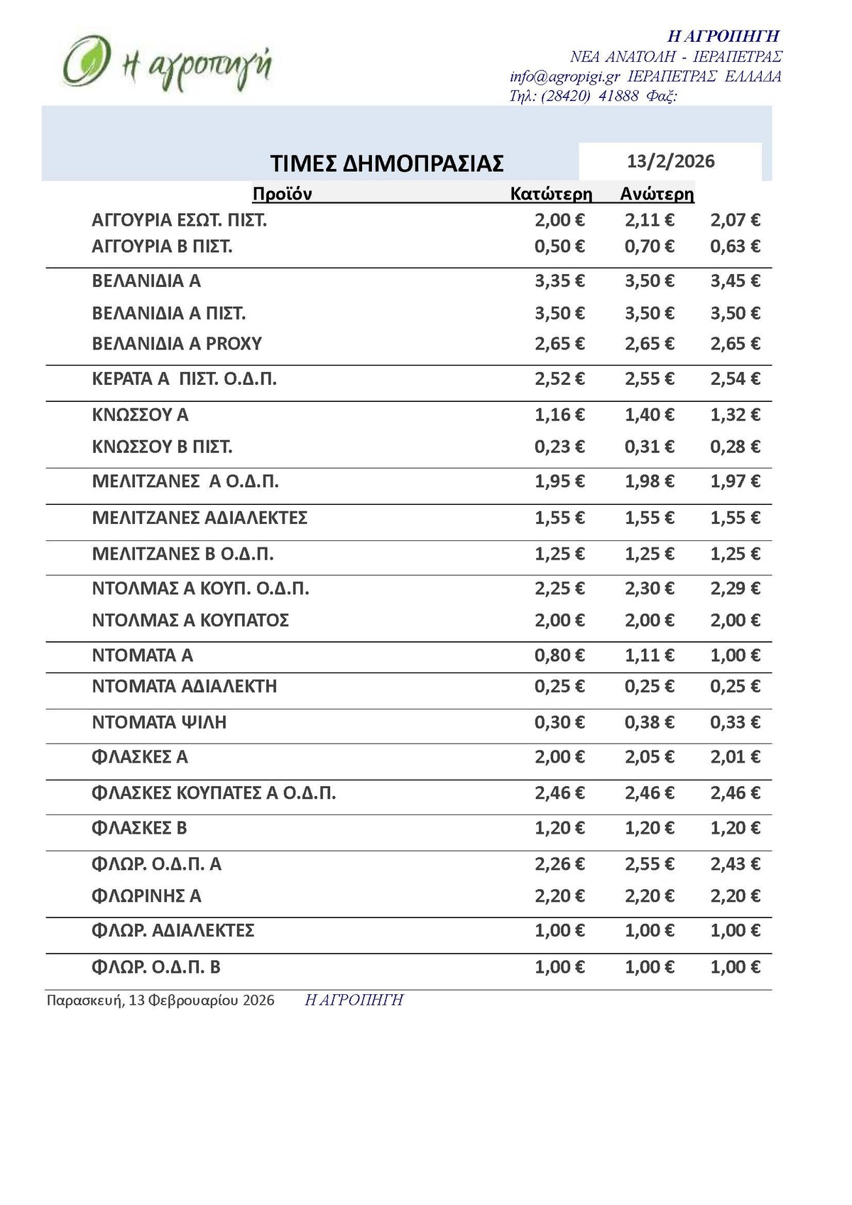 Τιμές Αγροτικών Προϊόντων 13.02.2026 ΤΙΜΕΣ 9:24 π.μ. - Παρασκευή 13 Φεβρουαρίου 2026 09:02 π.μ. - Παρ, 13/24/2026 ΙΕΡΑΠΕΤΡΑ, ΤΙΜΕΣ ΑΓΡΟΤΙΚΩΝ ΠΡΟΙΟΝΤΩΝ , ΔΗΜΟΠΡΑΤΗΡΙΟ, ΚΗΠΕΥΤΙΚΑ Δείτε τις σημερινές τιμές του δημοπρατηρίου