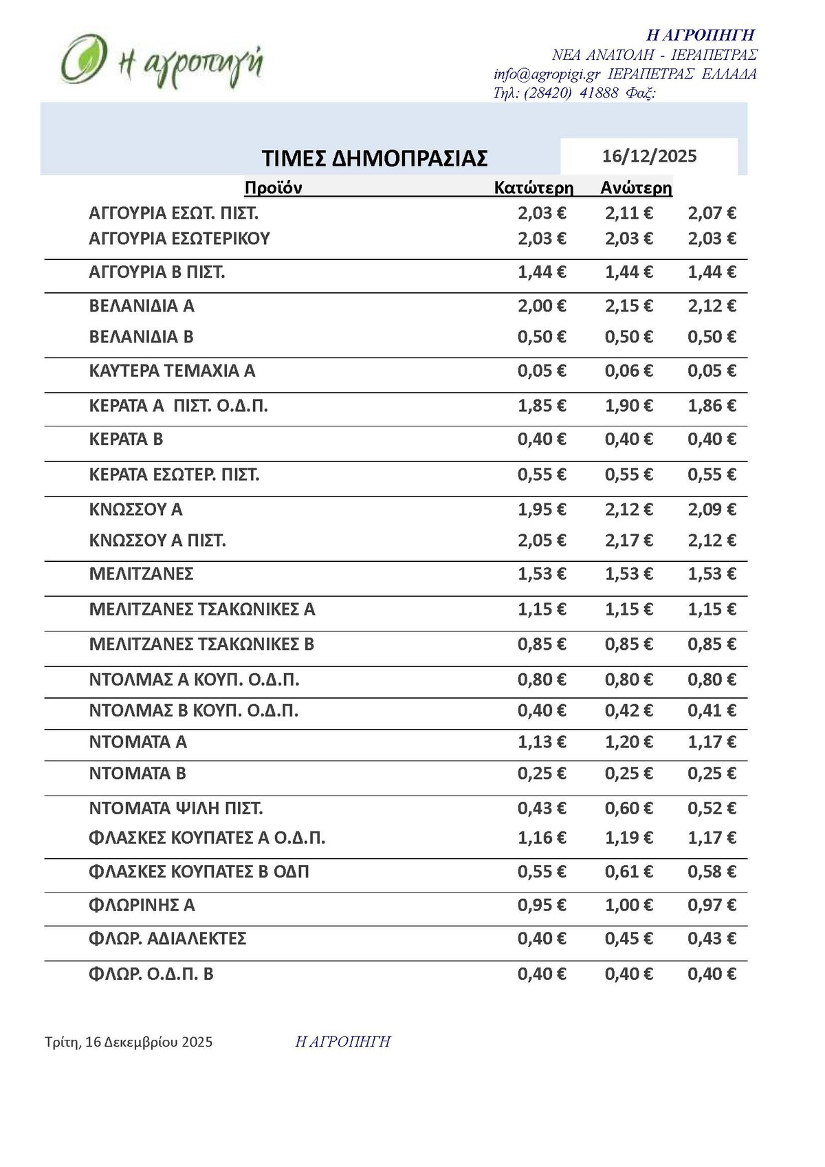 ΤΙΜΕΣ 03:22 μ.μ. - 16/12/2025 GOLDEN FARM |Τιμές Αγροτικών Προϊόντων 16.12.2025 ΙΕΡΑΠΕΤΡΑ, ΤΙΜΕΣ ΑΓΡΟΤΙΚΩΝ ΠΡΟΙΟΝΤΩΝ , ΔΗΜΟΠΡΑΤΗΡΙΟ, ΚΗΠΕΥΤΙΚΑ , GOLDEN FARM Δείτε τις σημερινές τιμές του δημοπρατηρίου