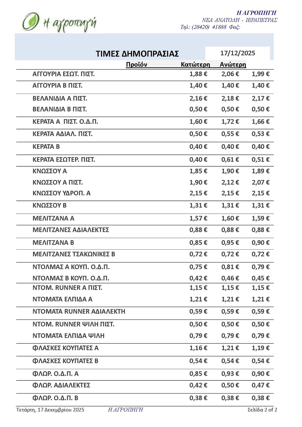 ΤΙΜΕΣ 03:22 μ.μ. - 16/12/2025 GOLDEN FARM |Τιμές Αγροτικών Προϊόντων 16.12.2025 ΙΕΡΑΠΕΤΡΑ, ΤΙΜΕΣ ΑΓΡΟΤΙΚΩΝ ΠΡΟΙΟΝΤΩΝ , ΔΗΜΟΠΡΑΤΗΡΙΟ, ΚΗΠΕΥΤΙΚΑ , GOLDEN FARM Δείτε τις σημερινές τιμές του δημοπρατηρίου