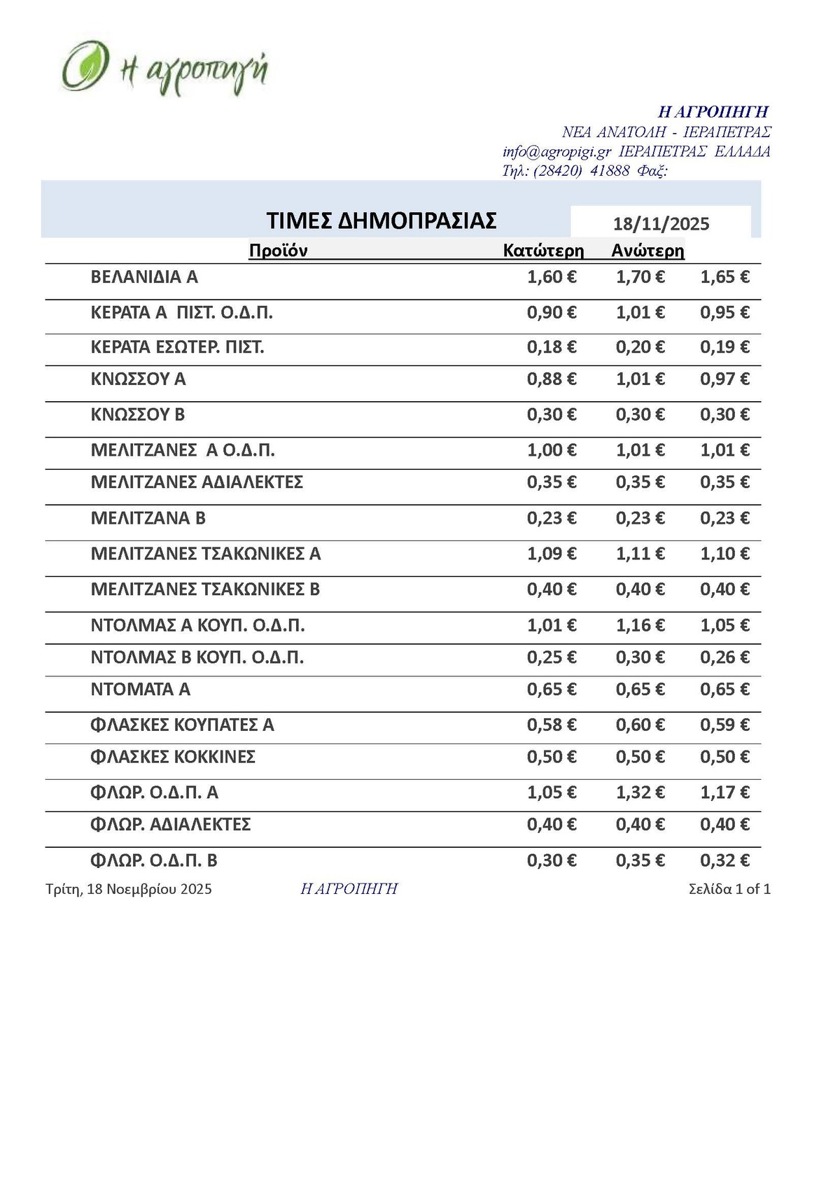 Τιμές Αγροτικών Προϊόντων 18.11.2025 ΤΙΜΕΣ 10:33 π.μ. - Τρίτη 18 Νοεμβρίου 2025 10:11 π.μ. - Τρί, 18/33/2025 ΙΕΡΑΠΕΤΡΑ, ΤΙΜΕΣ ΑΓΡΟΤΙΚΩΝ ΠΡΟΙΟΝΤΩΝ , ΔΗΜΟΠΡΑΤΗΡΙΟ, ΚΗΠΕΥΤΙΚΑ Δείτε τις σημερινές τιμές του δημοπρατηρίου