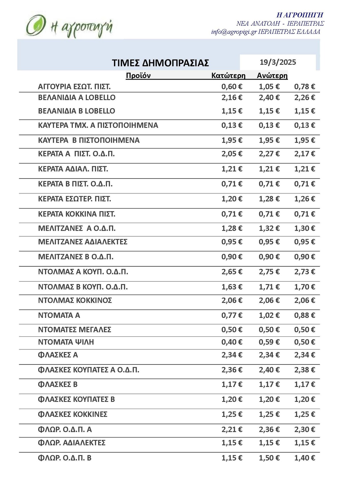 Τιμές Αγροτικών Προϊόντων 19.03.2025 ΤΙΜΕΣ 10:31 π.μ. - Τετάρτη, 19 Μαρτίου 2025 10:03 π.μ. - Τετ, 19/31/2025 ΤΙΜΕΣ ΑΓΡΟΤΙΚΩΝ ΠΡΟΙΟΝΤΩΝ Δείτε εδώ την πρώτη δημοπρασία της ημέρας
