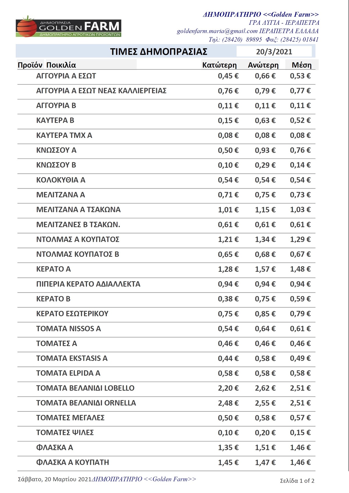Τιμές Αγροτικών Προϊόντων 20-3-21 ΙΕΡΑΠΕΤΡΑ 4:54 μ.μ. - Σάββατο 20 Μαρτίου 2021 04:03 μ.μ. - Σάβ, 20/54/2021 ΤΙΜΕΣ ΑΓΡΟΤΙΚΩΝ ΠΡΟΙΟΝΤΩΝ, ΔΗΜΟΠΡΑΤΗΡΙΟ Δείτε εδώ τιμές δημοπρατηρίων