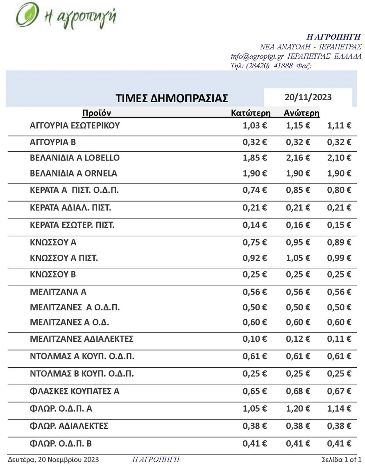 Τιμές αγροτικών προϊόντων 20.11.2023 ΤΙΜΕΣ 10:02 π.μ. - Δευτέρα, 20 Νοεμβρίου 2023 10:11 π.μ. - Δευ, 20/02/2023 ΤΙΜΕΣ ΑΓΡΟΤΙΚΩΝ ΠΡΟΙΟΝΤΩΝ Η πρώτη δημοπρασία της ημέρας
