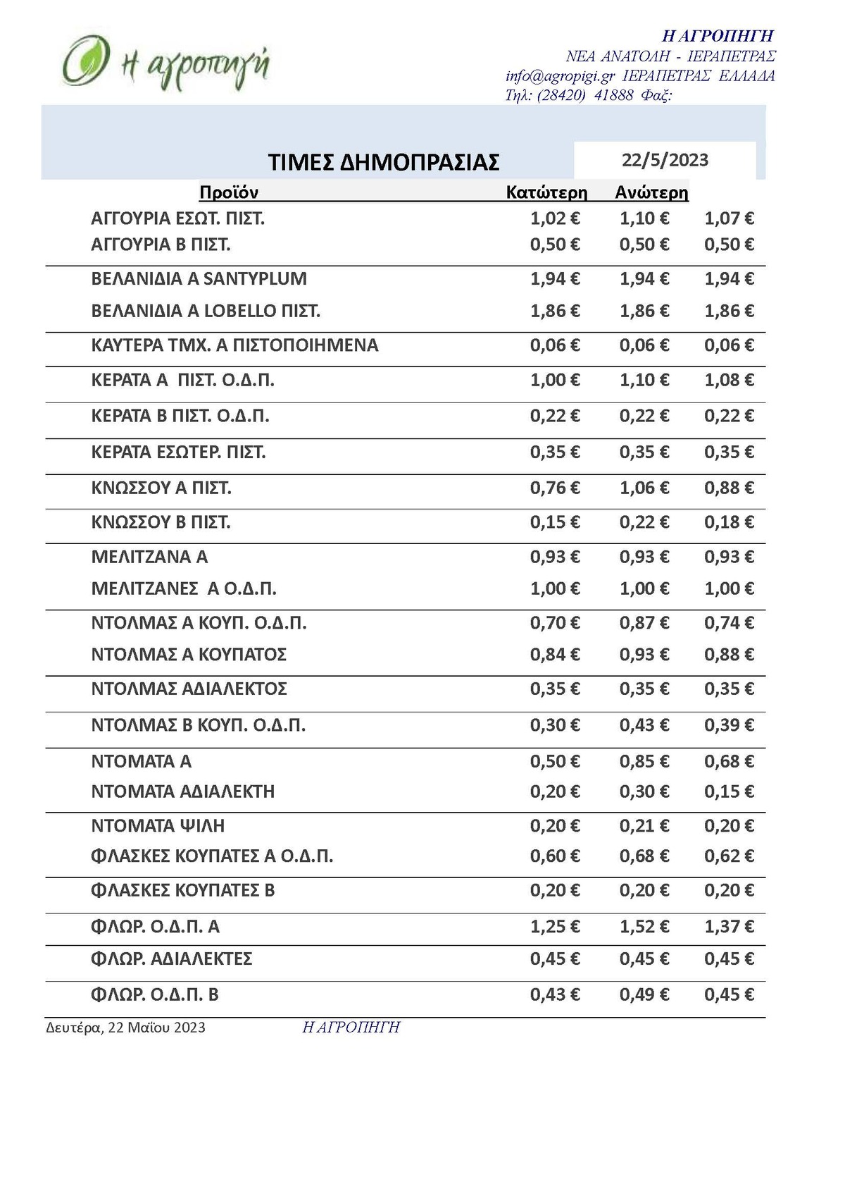 Τιμές Αγροτικών Προϊόντων 22.05.2023 ΤΙΜΕΣ 10:44 π.μ. - Δευτέρα, 22 Μαΐου 2023 10:05 π.μ. - Δευ, 22/44/2023 ΙΕΡΑΠΕΤΡΑ, ΤΙΜΕΣ ΑΓΡΟΤΙΚΩΝ ΠΡΟΙΟΝΤΩΝ, ΔΗΜΟΠΡΑΣΙΑ, ΑΓΡΟΠΗΓΗ Η πρώτη δημοπρασία της ημέρας