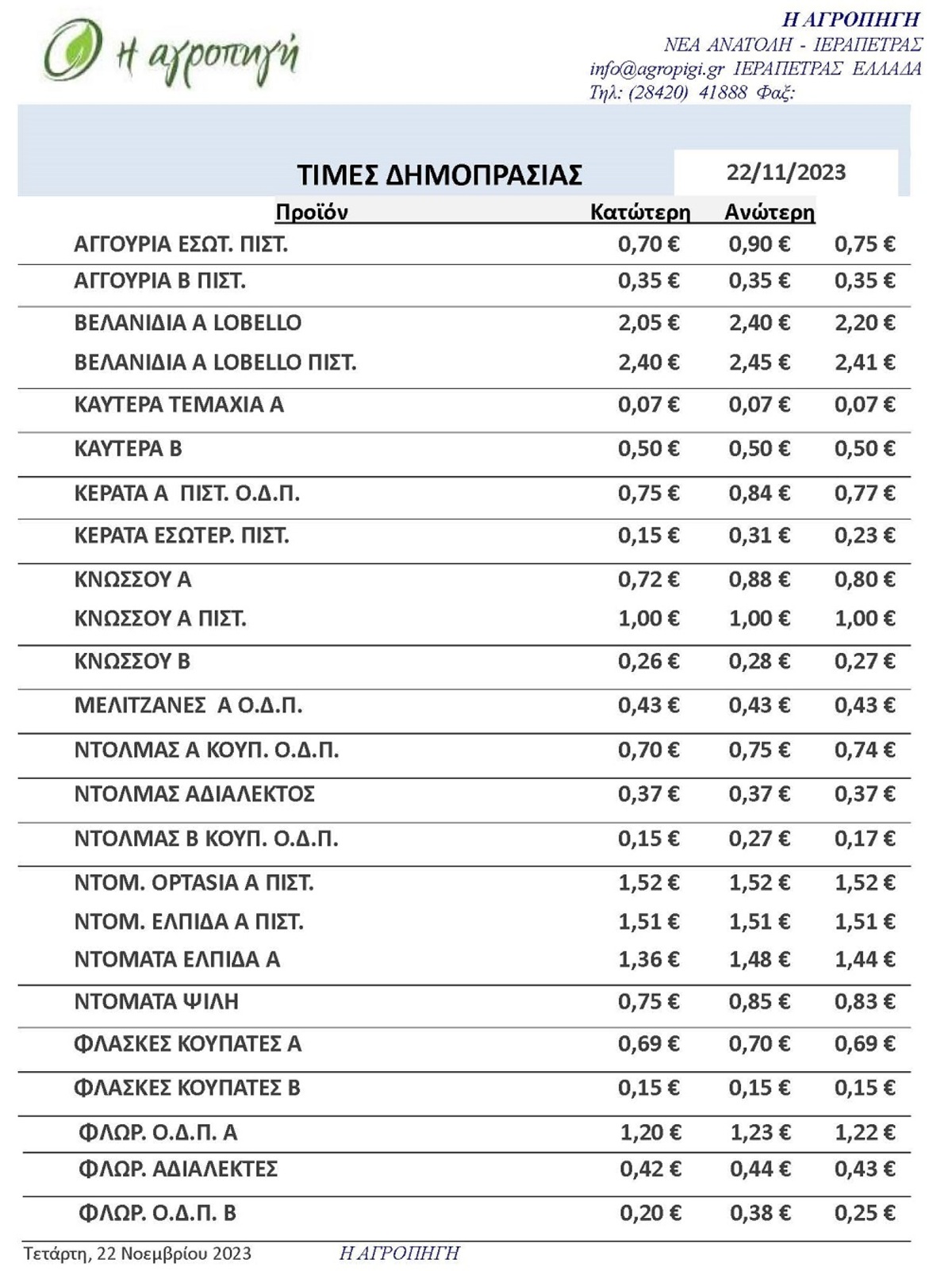 Τιμές αγροτικών προϊόντων 22.11.2023 ΤΙΜΕΣ 9:49 π.μ. - Τετάρτη, 22 Νοεμβρίου 2023 09:11 π.μ. - Τετ, 22/49/2023 ΤΙΜΕΣ ΑΓΡΟΤΙΚΩΝ ΠΡΟΙΟΝΤΩΝ Η πρώτη δημοπρασία της ημέρας