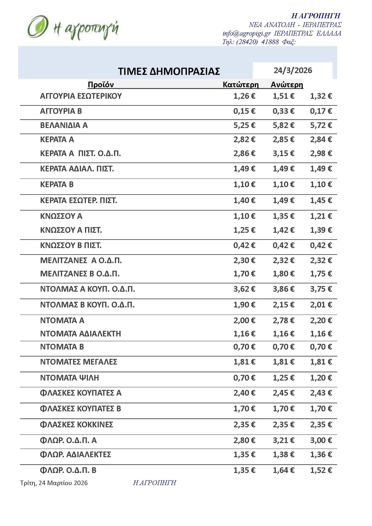 Τιμές Αγροτικών Προϊόντων 24.03.2026 ΤΙΜΕΣ 8:31 π.μ. - Τρίτη 24 Μαρτίου 2026 08:03 π.μ. - Τρί, 24/31/2026 ΙΕΡΑΠΕΤΡΑ, ΤΙΜΕΣ ΑΓΡΟΤΙΚΩΝ ΠΡΟΙΟΝΤΩΝ , ΔΗΜΟΠΡΑΤΗΡΙΟ, ΚΗΠΕΥΤΙΚΑ Δείτε τις σημερινές τιμές του δημοπρατηρίου