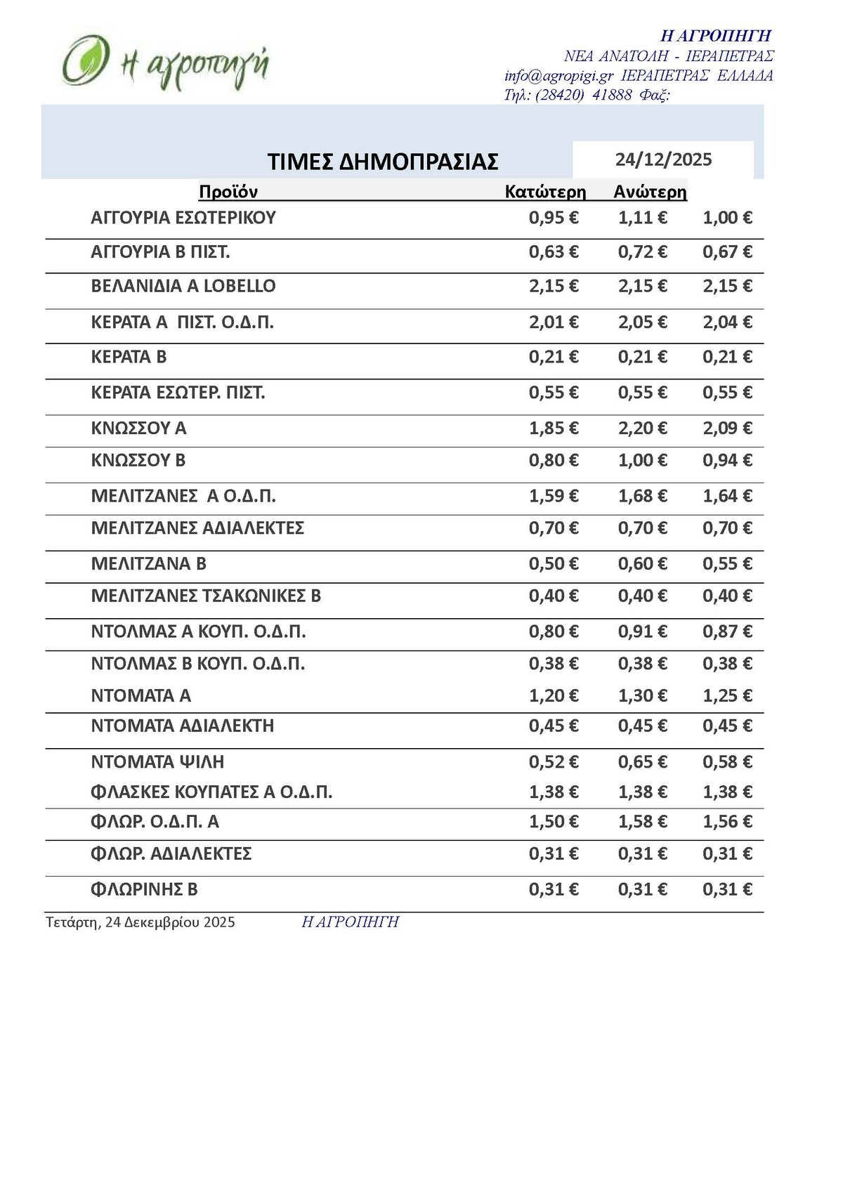 Τιμές Αγροτικών Προϊόντων 24.12.2025 ΤΙΜΕΣ 12:17 μ.μ. - Τετάρτη, 24 Δεκεμβρίου 2025 12:12 μ.μ. - Τετ, 24/17/2025 ΙΕΡΑΠΕΤΡΑ, ΤΙΜΕΣ ΑΓΡΟΤΙΚΩΝ ΠΡΟΙΟΝΤΩΝ, ΔΗΜΟΠΡΑΤΗΡΙΟ, ΚΗΠΕΥΤΙΚΑ Δείτε τις σημερινές τιμές του δημοπρατηρίου