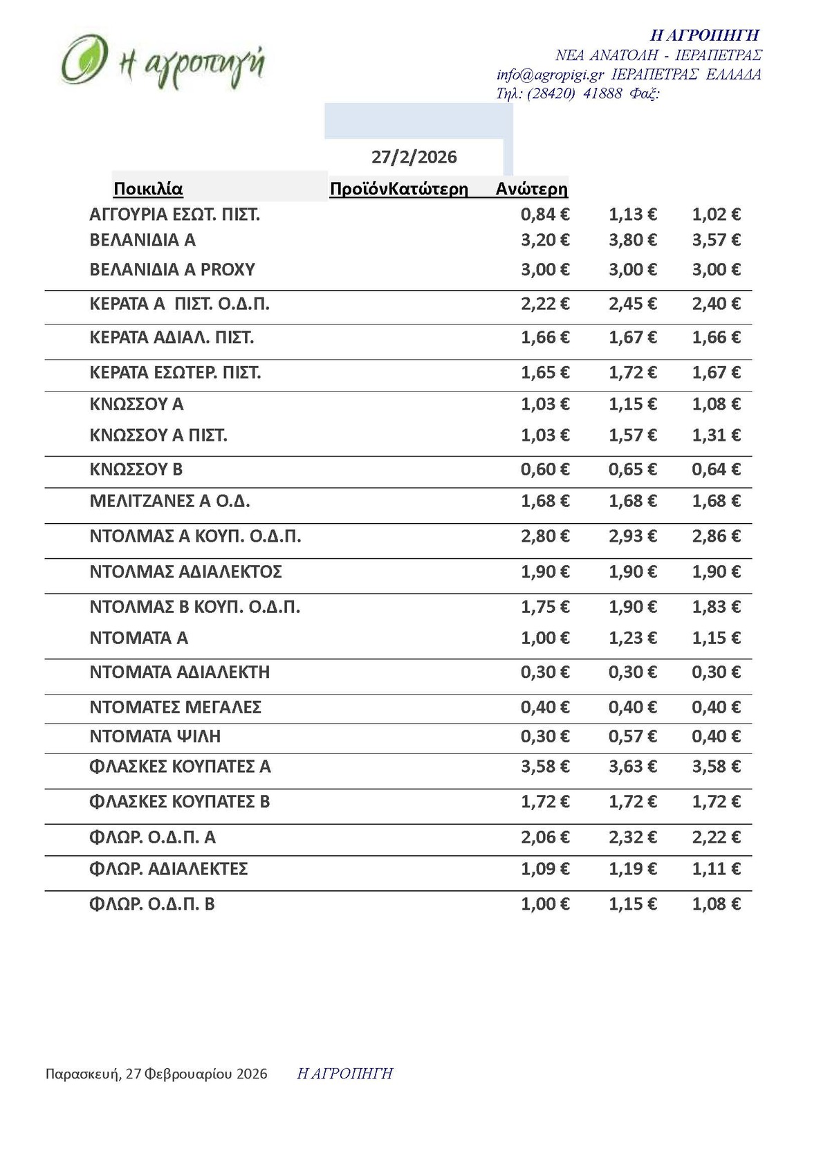 Τιμές Αγροτικών Προϊόντων 27.02.2026 ΤΙΜΕΣ 8:38 π.μ. - Παρασκευή 27 Φεβρουαρίου 2026 08:02 π.μ. - Παρ, 27/38/2026 ΙΕΡΑΠΕΤΡΑ, ΤΙΜΕΣ ΑΓΡΟΤΙΚΩΝ ΠΡΟΙΟΝΤΩΝ , ΔΗΜΟΠΡΑΤΗΡΙΟ, ΚΗΠΕΥΤΙΚΑ Δείτε τις σημερινές τιμές του δημοπρατηρίου