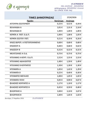 ΤΙΜΕΣ 07:34 π.μ. - 28/04/2026 Τιμές Αγροτικών Προϊόντων 28.04.2026 ΙΕΡΑΠΕΤΡΑ, ΤΙΜΕΣ ΑΓΡΟΤΙΚΩΝ ΠΡΟΙΟΝΤΩΝ, ΔΗΜΟΠΡΑΤΗΡΙΟ, ΚΗΠΕΥΤΙΚΑ Δείτε τις σημερινές τιμές του δημοπρατηρίου