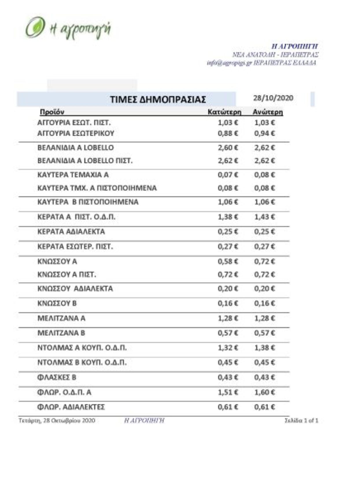 Τιμές Αγροτικών Προϊόντων 28.10.2020 ΙΕΡΑΠΕΤΡΑ 10:57 π.μ. - Τετάρτη 28 Οκτωβρίου 2020 10:10 π.μ. - Τετ, 28/57/2020 ΤΙΜΕΣ ΑΓΡΟΤΙΚΩΝ ΠΡΟΙΟΝΤΩΝ Δείτε εδώ τις τιμές των δημοπρατηρίων