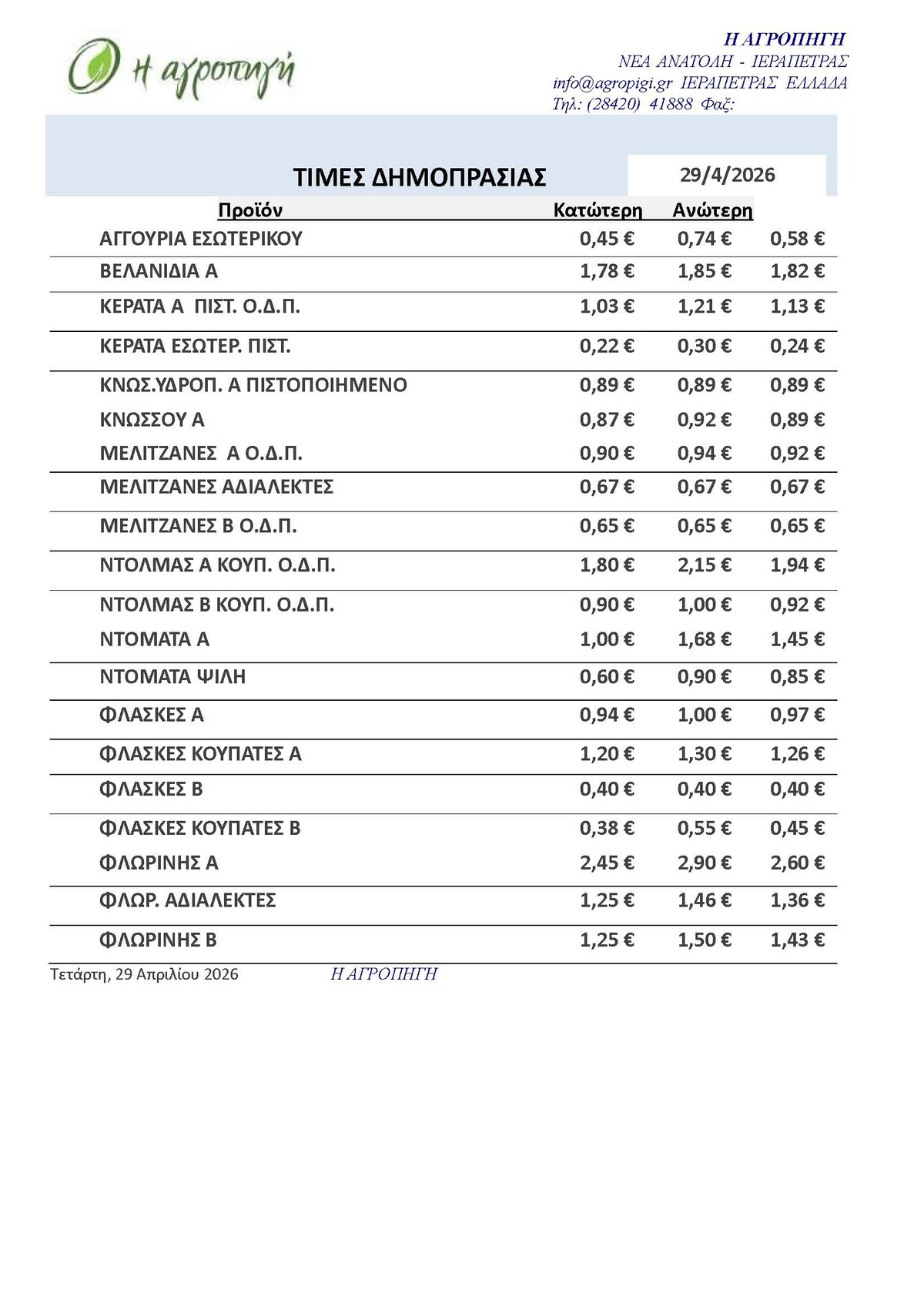 Τιμές Αγροτικών Προϊόντων 29.04.2026 ΤΙΜΕΣ 7:13 π.μ. - Τετάρτη 29 Απριλίου 2026 07:04 π.μ. - Τετ, 29/13/2026 ΙΕΡΑΠΕΤΡΑ, ΤΙΜΕΣ ΑΓΡΟΤΙΚΩΝ ΠΡΟΙΟΝΤΩΝ , ΔΗΜΟΠΡΑΣΙΑ, ΚΗΠΕΥΤΙΚΑ ΠΡΟΙΟΝΤΑ Δείτε τις σημερινές τιμές του δημοπρατηρίου