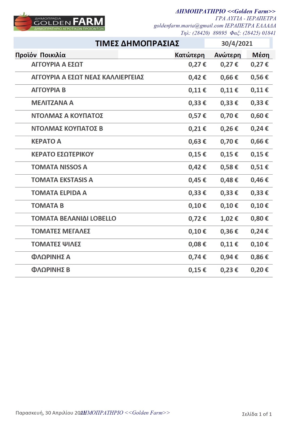 Τιμές Αγροτικών Προϊόντων 30.04.2021 ΙΕΡΑΠΕΤΡΑ 1:29 μ.μ. - Παρασκευή 30 Απριλίου 2021 01:04 μ.μ. - Παρ, 30/29/2021 ΤΙΜΕΣ ΑΓΡΟΤΙΚΩΝ ΠΡΟΙΟΝΤΩΝ, ΔΗΜΟΠΡΑΤΗΡΙΟ, GOLDENFARM Δείτε εδώ τιμές δημοπρατηρίων της Ιεράπετρας