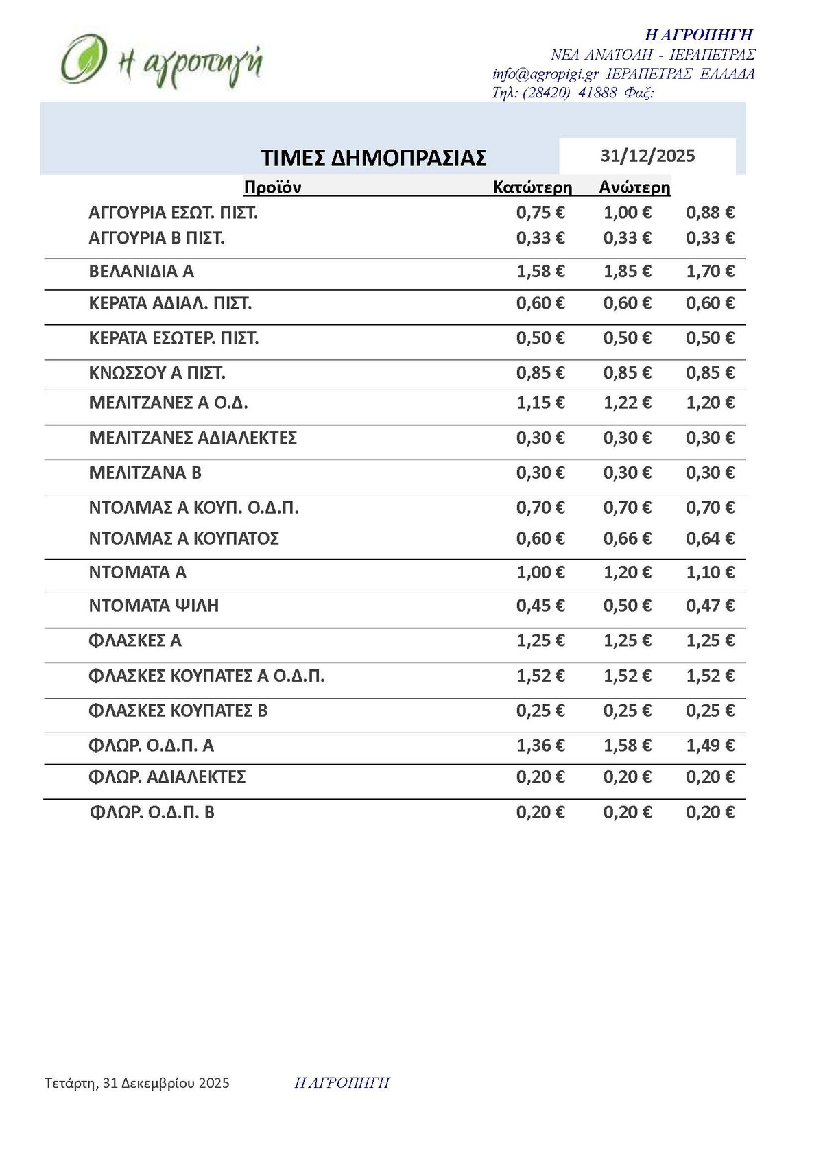 Τιμές Αγροτικών Προϊόντων 31.12.2025 ΤΙΜΕΣ 2:06 μ.μ. - Τετάρτη, 31 Δεκεμβρίου 2025 02:12 μ.μ. - Τετ, 31/06/2025 ΙΕΡΑΠΕΤΡΑ, ΤΙΜΕΣ ΑΓΡΟΤΙΚΩΝ ΠΡΟΙΟΝΤΩΝ , ΔΗΜΟΠΡΑΤΗΡΙΟ, ΚΗΠΕΥΤΙΚΑ Δείτε τις σημερινές τιμές του δημοπρατηρίου