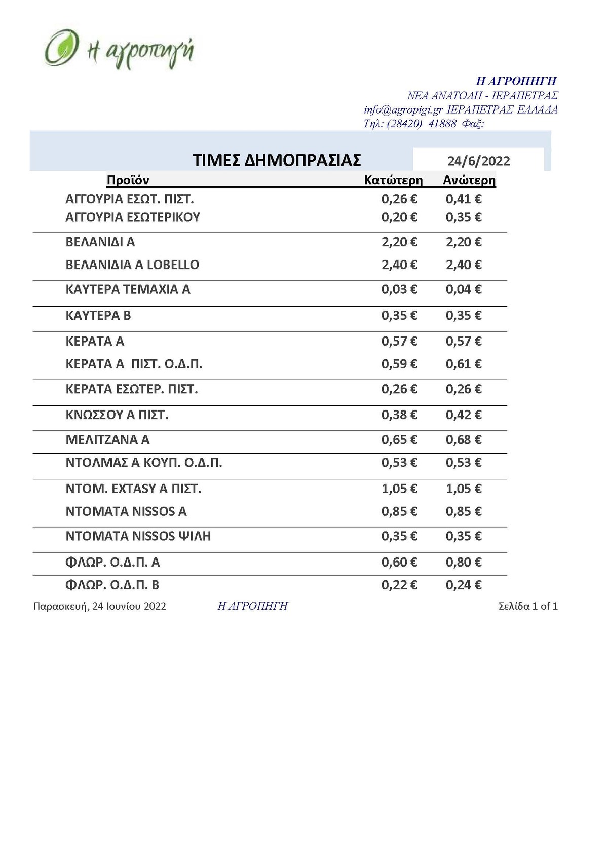 Τιμές Αγροτικών Προϊόντων για σήμερα 24.06.2022 ΛΑΣΙΘΙ ΙΕΡΑΠΕΤΡΑ 11:33 π.μ. - Παρασκευή, 24 Ιουνίου 2022 11:06 π.μ. - Παρ, 24/33/2022 ΤΙΜΕΣ ΑΓΡΟΤΙΚΩΝ ΠΡΟΙΟΝΤΩΝ, ΤΙΜΕΣ Η πρώτη δημοπρασία της ημέρας