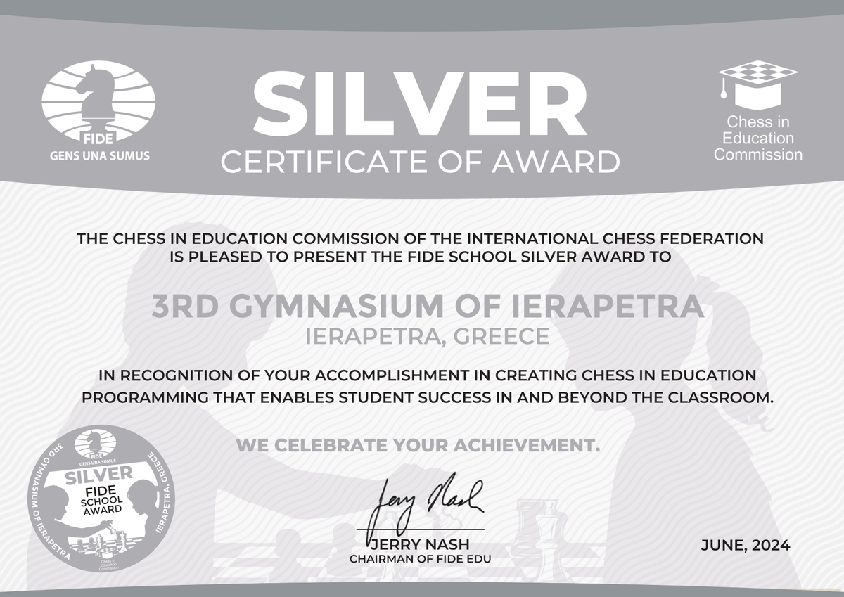 Κλιθήκαμε λοιπόν, να απαντήσουμε σε κάθε ερώτηση με όσο το δυνατόν περισσότερες λεπτομέρειες και να παράσχουμε αποδεικτικά στοιχεία (φωτογραφικό υλικό, σύντομα βίντεο, συνδέσμους ιστοσελίδων, προωθητικό υλικό, αποκόμματα εφημερίδων, μαρτυρίες μαθητών κτλ). Ο φάκελος μας κατατέθηκε τον Απρίλιο, αξιολογήθηκε και σήμερα έχουμε την χαρά να ανακοινώνουμε την απόκτηση του Αργυρού Βραβείου Πιστοποίησης της FIDE και ένα από τα 22 συνολικά σε παγκόσμια κλίμακα. Η επίσημη βράβευση των διακριθέντων σχολείων θα γίνει στα μέσα Σεπτέμβρη στα πλαίσια της Ολυμπιάδας Σκακιού στη Βουδαπέστη της Ουγγαρίας.