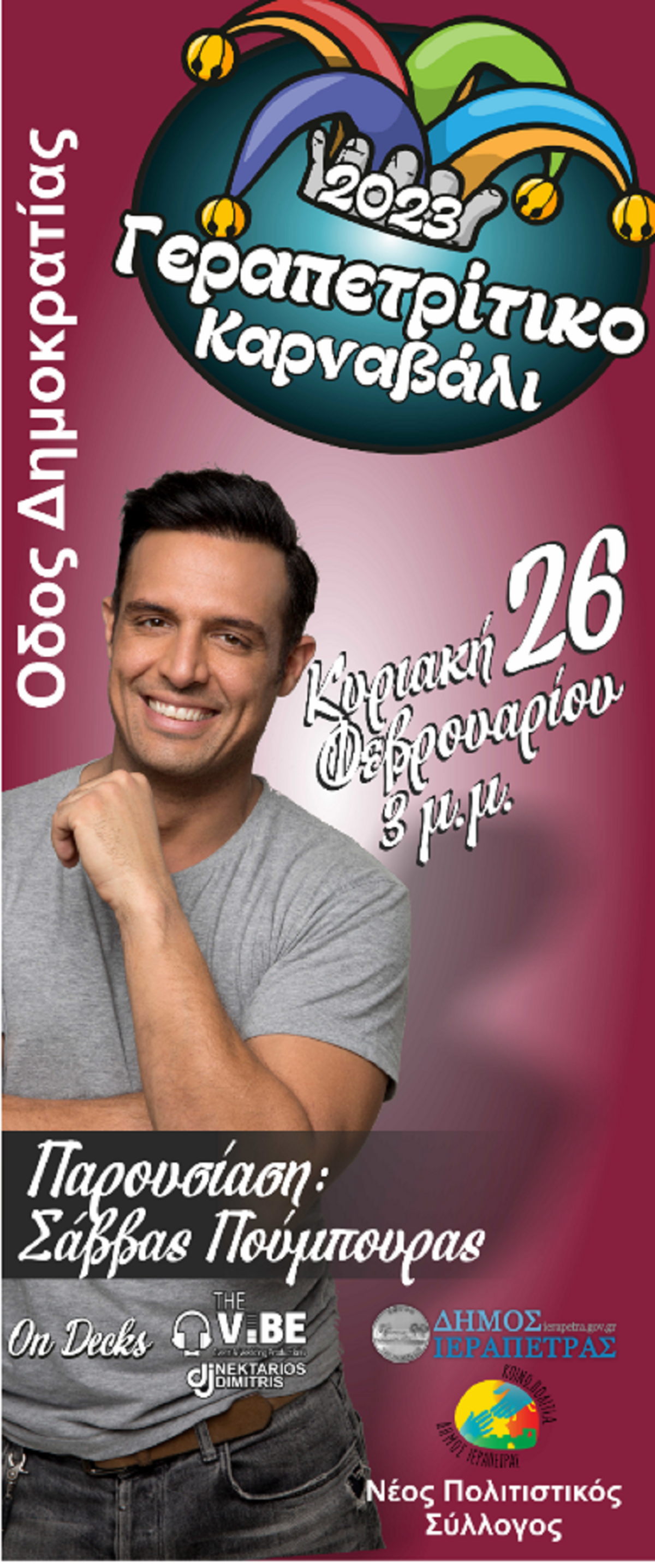 Γεραπετρίτικο καρναβάλι στην οδό Δημοκρατίας με παρουσιαστή το Σάββα Πούμπουρα και βασίλισσα του καρναβαλιού η Σαμάνθα Μίσοβιτς. Έναξη 15.00.