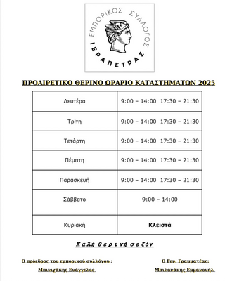 Ο Εμπορικός Σύλλογος Ιεράπετρας ενημερώνει ότι από 02/06/2025, τίθεται σε ισχύ το προαιρετικό θερινό ωράριο λειτουργίας των εμπορικών καταστημάτων της πόλης. Το ωράριο αυτό εφαρμόζεται κατά την καλοκαιρινή περίοδο, με στόχο την καλύτερη εξυπηρέτηση του καταναλωτικού κοινού και την προσαρμογή στις αυξημένες ανάγκες της τουριστικής περιόδου.