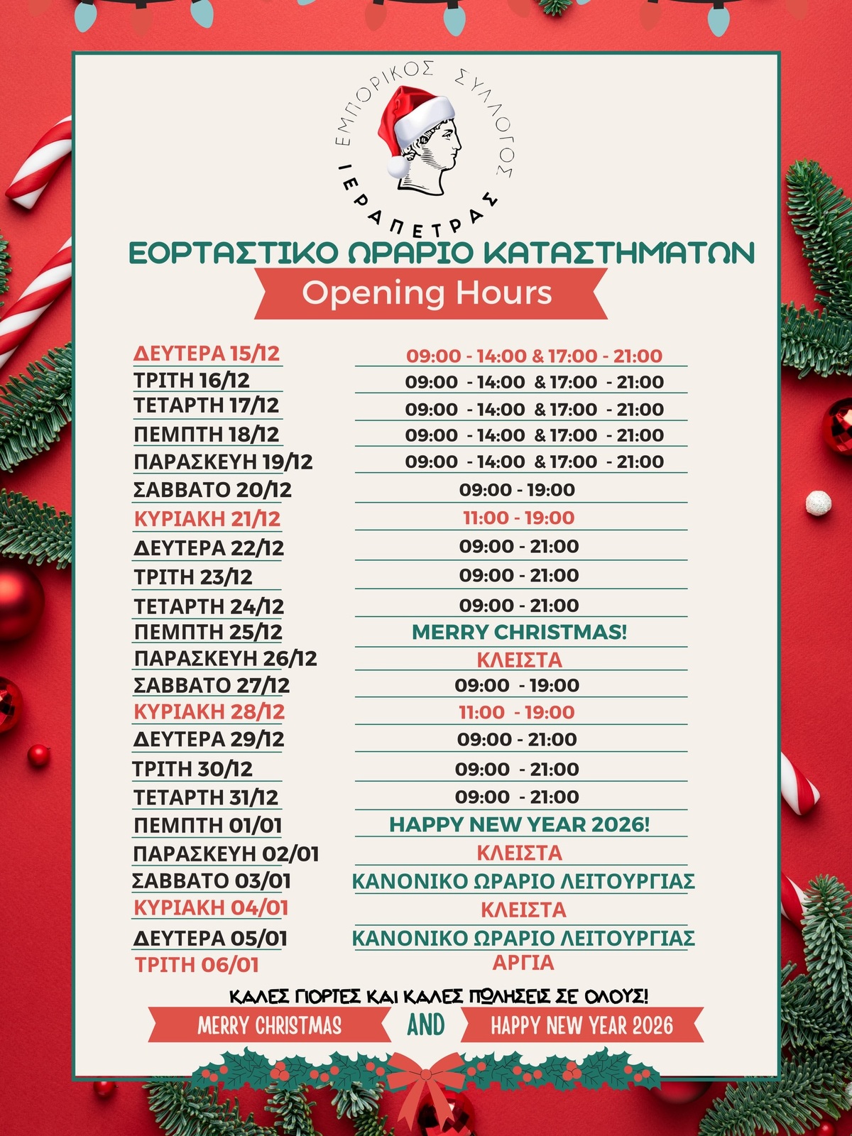 Ο Εμπορικός Σύλλογος Ιεράπετρας ανακοινώνει το εορταστικό ωράριο λειτουργίας των καταστημάτων για την περίοδο των Χριστουγέννων και της Πρωτοχρονιάς.